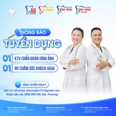 Hệ thống Nha khoa AB là một trong những chuỗi nha khoa uy tín hàng đầu tại Thành phố Huế và miền Trung với đội ngũ Bác sĩ giàu kinh nghiệm, trang thiết bị hiện đại và dịch vụ chăm sóc khách hàng tận tâm. Chúng tôi không ngừng mở rộng và phát triển để mang đến chất lượng điều trị tốt nhất cho khách hàng. Do đó, việc tuyển dụng và đào tạo nhân sự là một trong những chiến lược quan trọng nhằm đảm bảo sự phát triển bền vững.